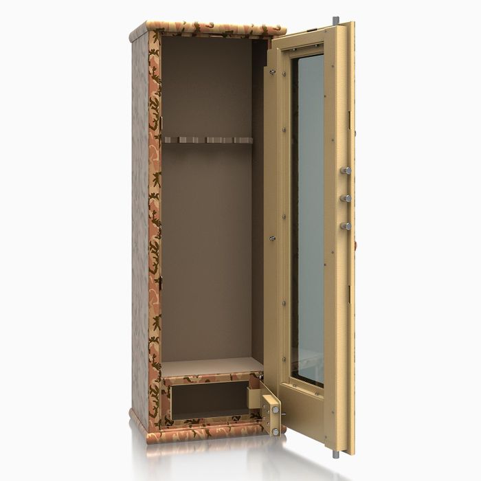 These safes can be configured as gun safes (with gun holders) or display safes (with glass shelves). A combination of both is also possible.