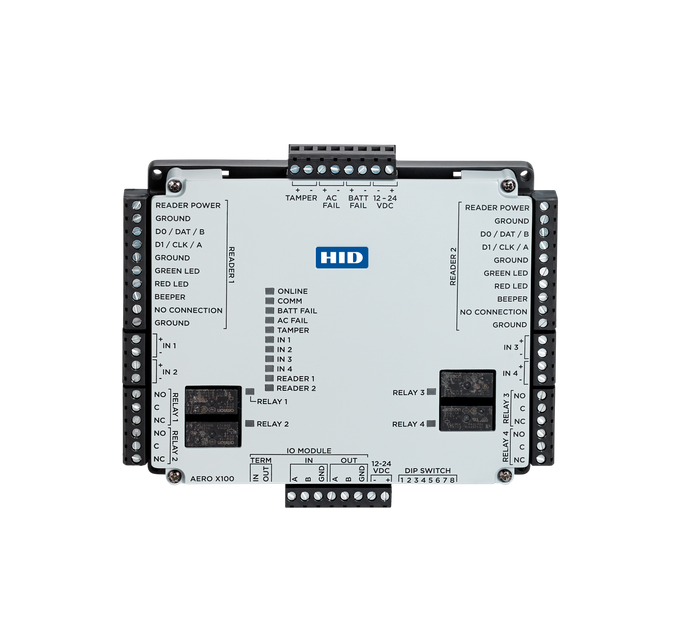 The HID Aero X100 is a secure door controller that manages up to two access points with precise monitoring and reliable output control. Its supervised inputs track door status and power conditions in real time, while robust relays handle locks and auxiliary devices. With OSDP reader support and encrypted communication, it delivers dependable, scalable access management.