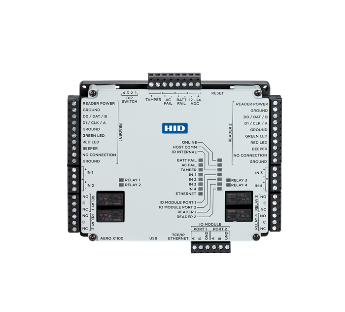 The HID Aero X1100 is a powerful intelligent controller that forms the core of a modern access control system. It manages two doors directly and scales easily using expansion modules, supporting up to 64 readers and hundreds of inputs and outputs. With encrypted communication and supervised monitoring, it delivers secure, flexible and enterprise‑ready door control.