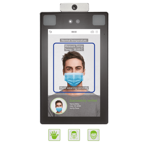 Powered by the ZKTeco-customized CPU for running the intellectualized engineering facial recognition algorithm and the latest computer vision technology, ProFace X [TD] supports both facial and palm verification with large capacity and rapid recognition speed, boosting the security performance in all aspects. ProFace X [TD] also helps eliminate hygiene concerns; not only because of the contactless recognition technology it is equipped with, but also because of the new functions namely body temperature detection and masked individual identification. The facial recognition capability has reached a new height in the biometrics technology industry with a maximum of 50,000 facial templates, recognition speed of less than 0.3 sec per face, and ultimate anti-spoofing ability against almost all types of fake photos and videos attack.In addition, the 3-in-1 palm recognition (Palm Shape, Palm Print and Palm Vein) is performed in 0.35 sec per hand; the palm data acquired will be compared with a maximum of 5,000 palm templates.As mentioned above, ProFace X [TD] can assist in reducing the risk of infection and germs spreading during the recent global public health issue as well. The enables fast and accurate body temperature measurement and masked individual identification during facial and palm verification at all access points, especially in hospitals, factories, schools, commercial buildings, airports, stations, and other public areas.