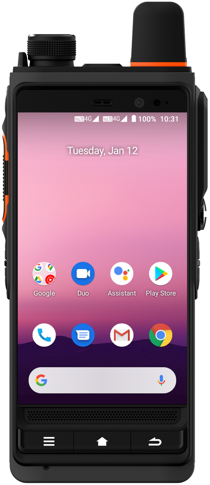 It features a classic PTT button, a rotating select switch, and a 4-inch touchscreen with an Android interface. With front and rear cameras, it supports video calls and photography.