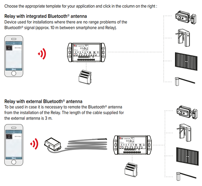 - Smart Relay with Remote Bluetooth Smart 5.0 – Designed for greater flexibility, this model allows the Bluetooth antenna to be installed up to 3 meters from the main unit, making it ideal for complex access control environments.